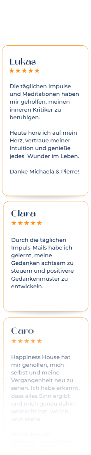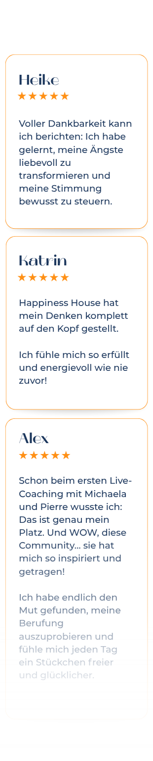 Wir, Michaela & Pierre, haben Happiness House als Dein digitales Zuhause geschaffen, um Dir die Möglichkeit zu geben, Deine Schwingung zu erhöhen und den Weg in mehr Leichtigkeit, Freiheit und Glück zu erschaffen.